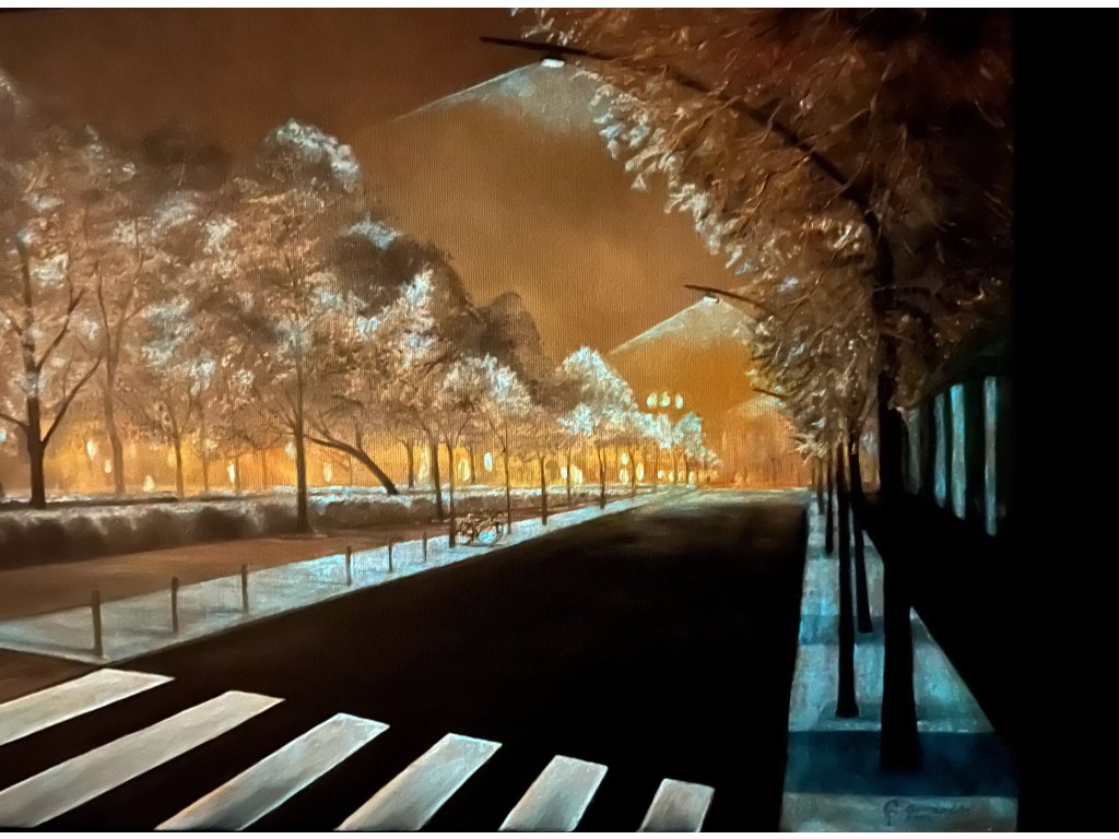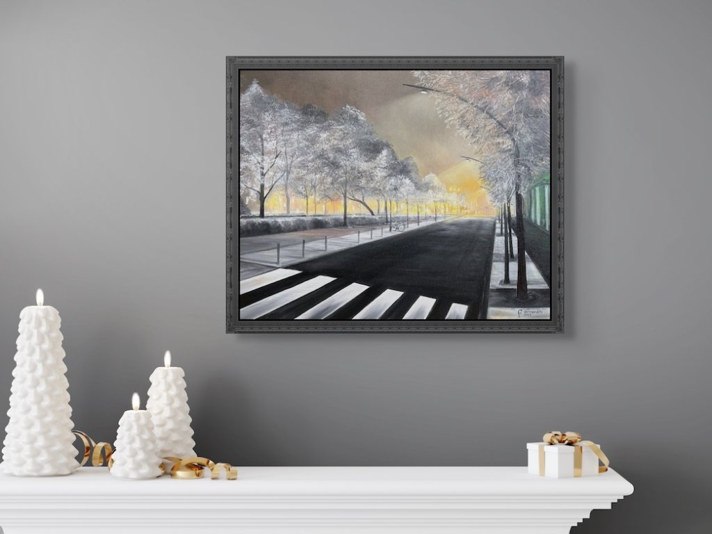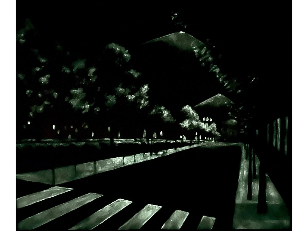 Nappal a finom kontrasztok, aranyló reflexiók és strukturált ecsetvonások dominálnak, megidézve a csendes éjszaka hangulatát. Amikor leszáll az igazi sötétség, a festmény életre kel: a különleges, foszforeszkáló pigmentek felsejlenek, kiemelve az épületek, fényfoltok és útvonalak fő motívumait. A város körvonalai lágy, lebegő fénybe burkolóznak, mintha maga a látkép kezdene lassan világítani.