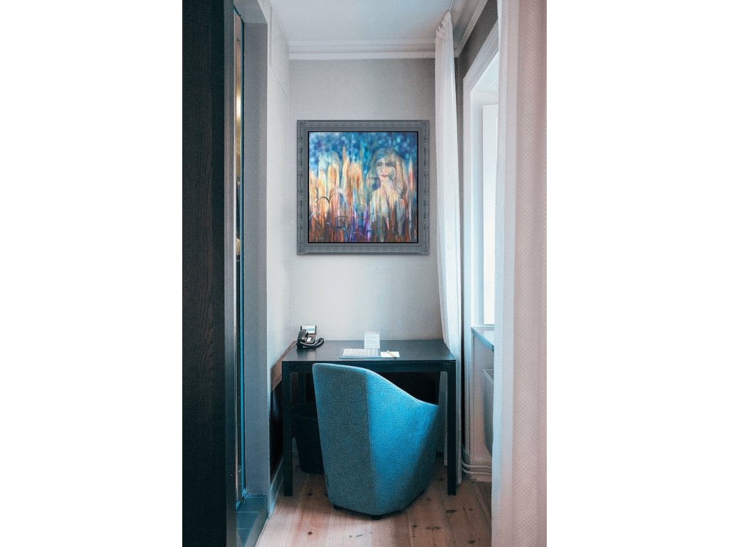 Az előtérben felbukkanó arcot finom, csillogó, kacskaringós vonalakkal ábrázolta az alkotó. Mintha jelentőség teljesen várna valamire, ami hamarosan elkövetkezik.